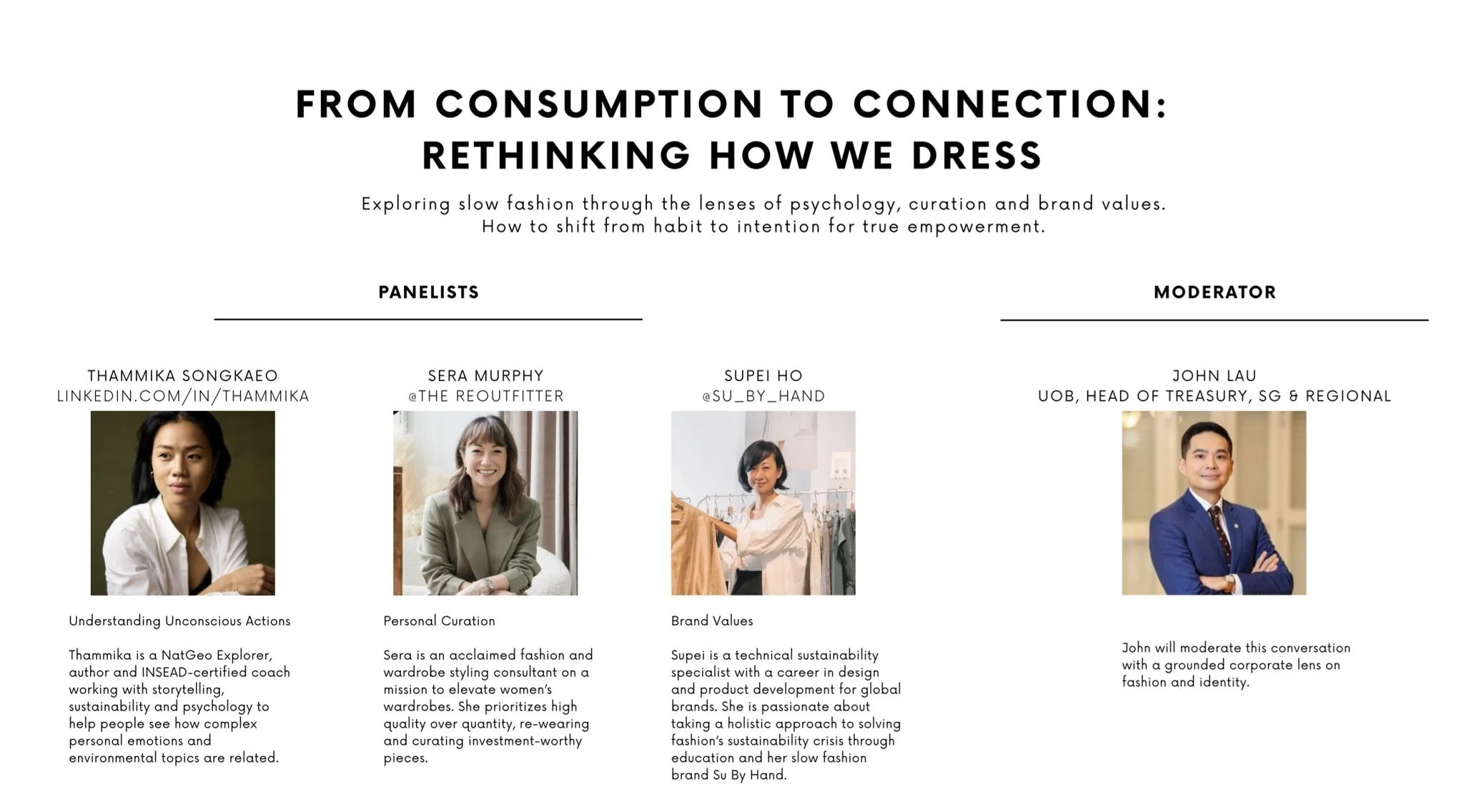 Panelist at UOB’s first Sustainability Month 2025, a month long series of workshops, talks and education aimed to help employees think about sustainability differently. Q3 2025.